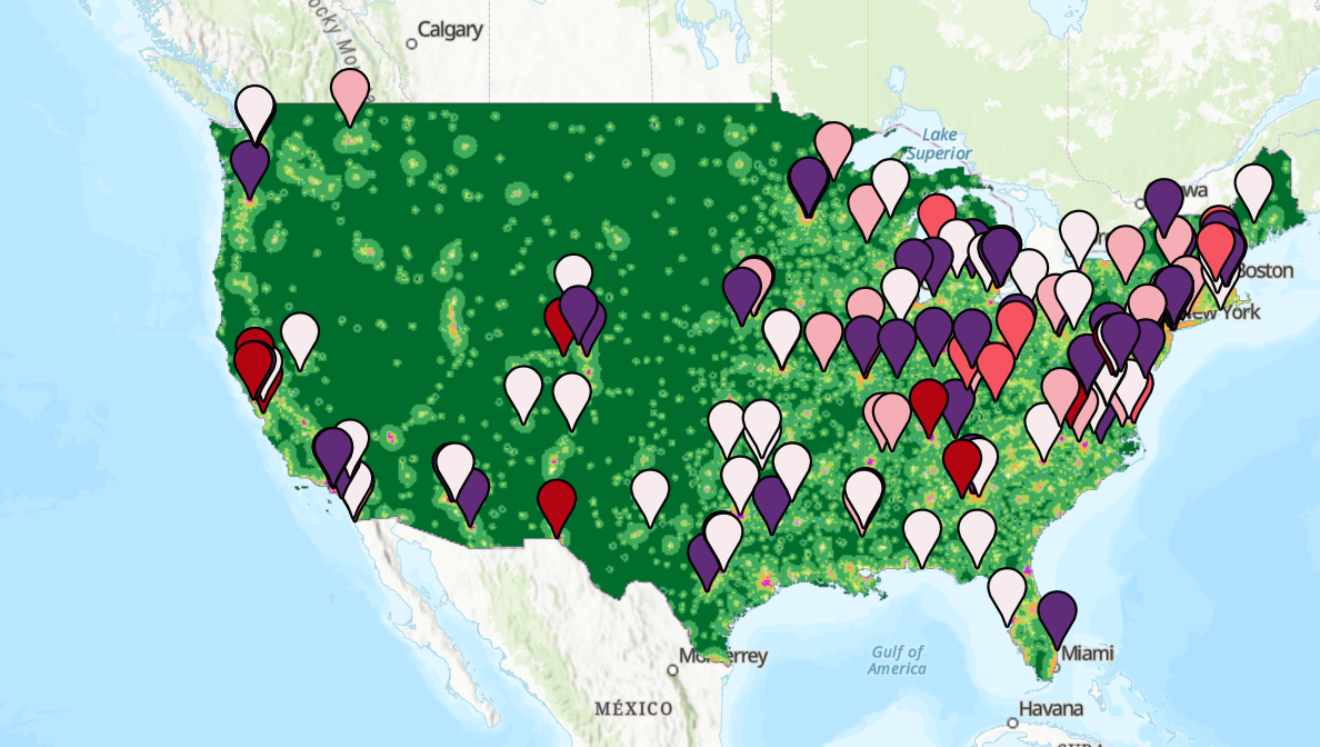 Figure 1. Map of survey respondents overlaid on NCES population density map, color coded by program size based on number of youth served. Not pictured, two responses from Alaska, one from Puerto Rico.