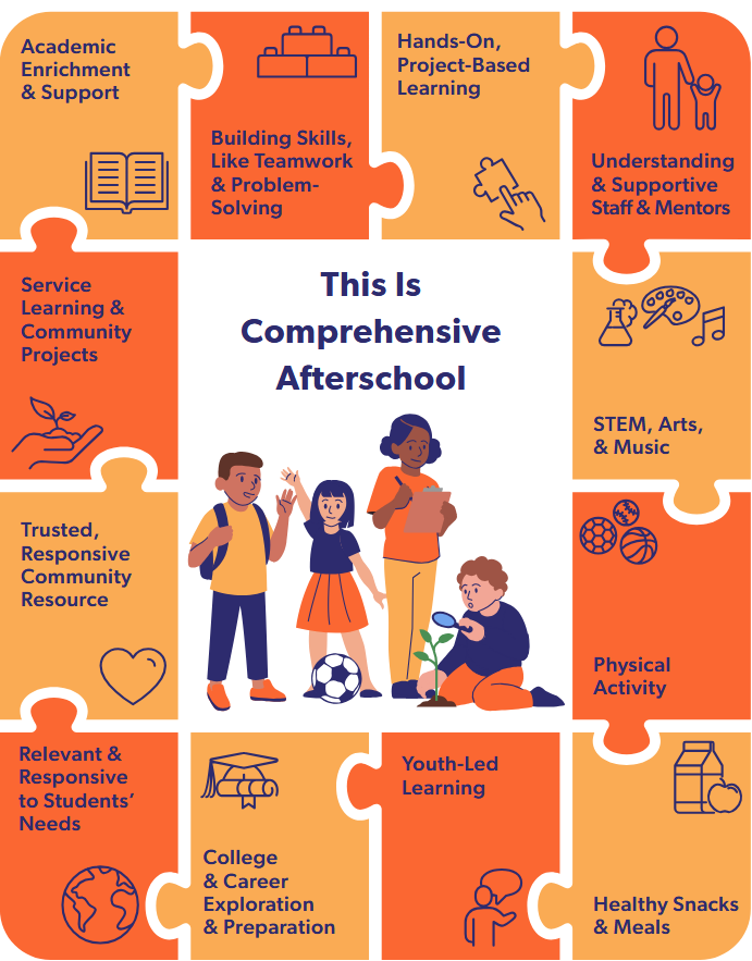 Take a look at the one-pager for a quick overview of comprehensive afterschool programs. Want to dive deeper? Check out the brief, which also includes spotlights on afterschool programs and takeaways from a survey of program providers.